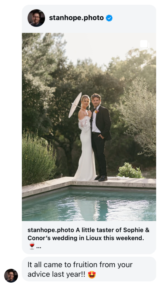 Within a week of following these principles, James booked TWO destination weddings. Now around a third of his bookings are destination.